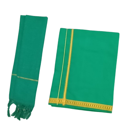 Men’s Cotton Blend Green Dhoti and Towel Set – Solid Pattern, Overlocked Edges, Size 1.23 x 1.87 M